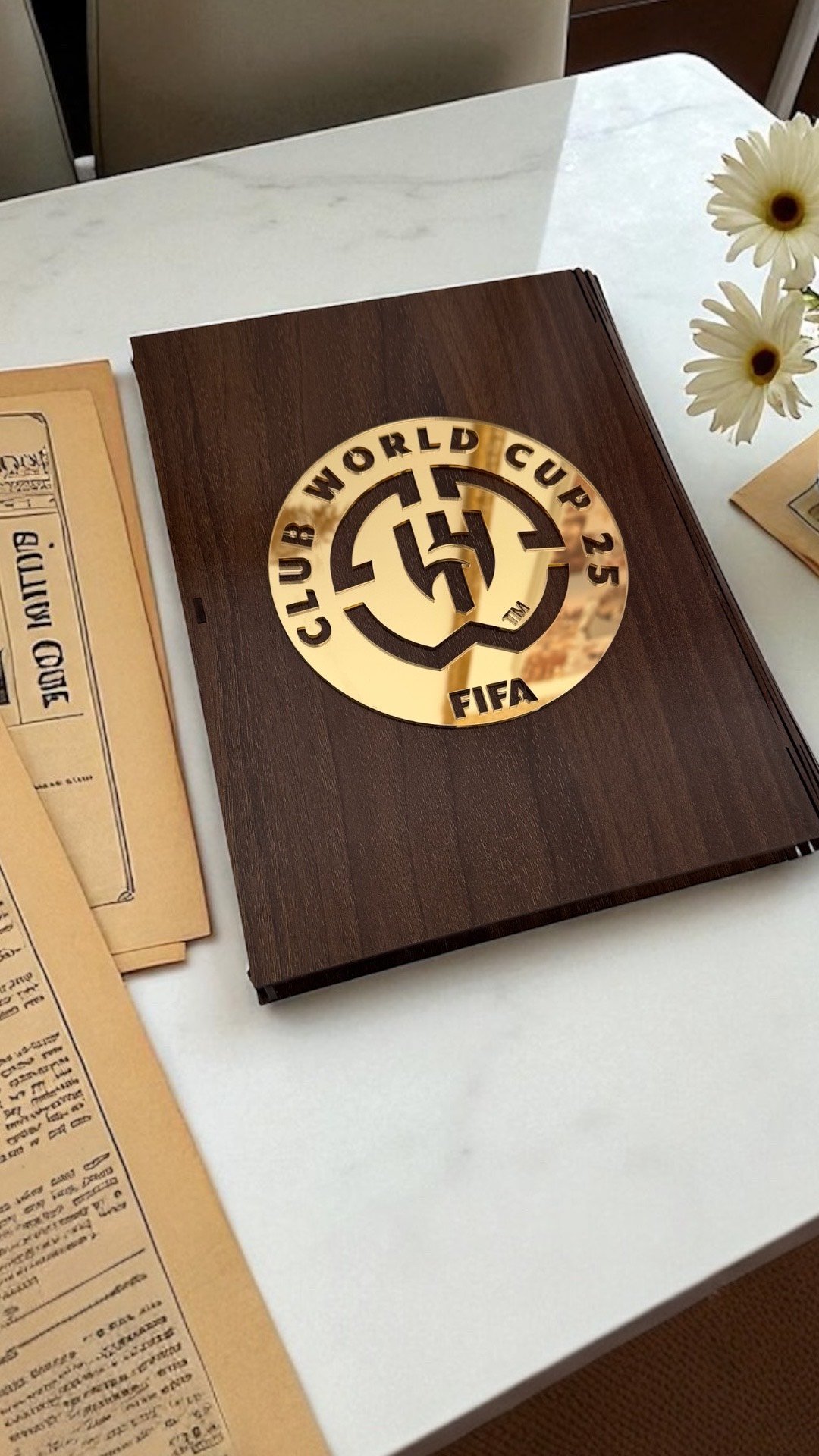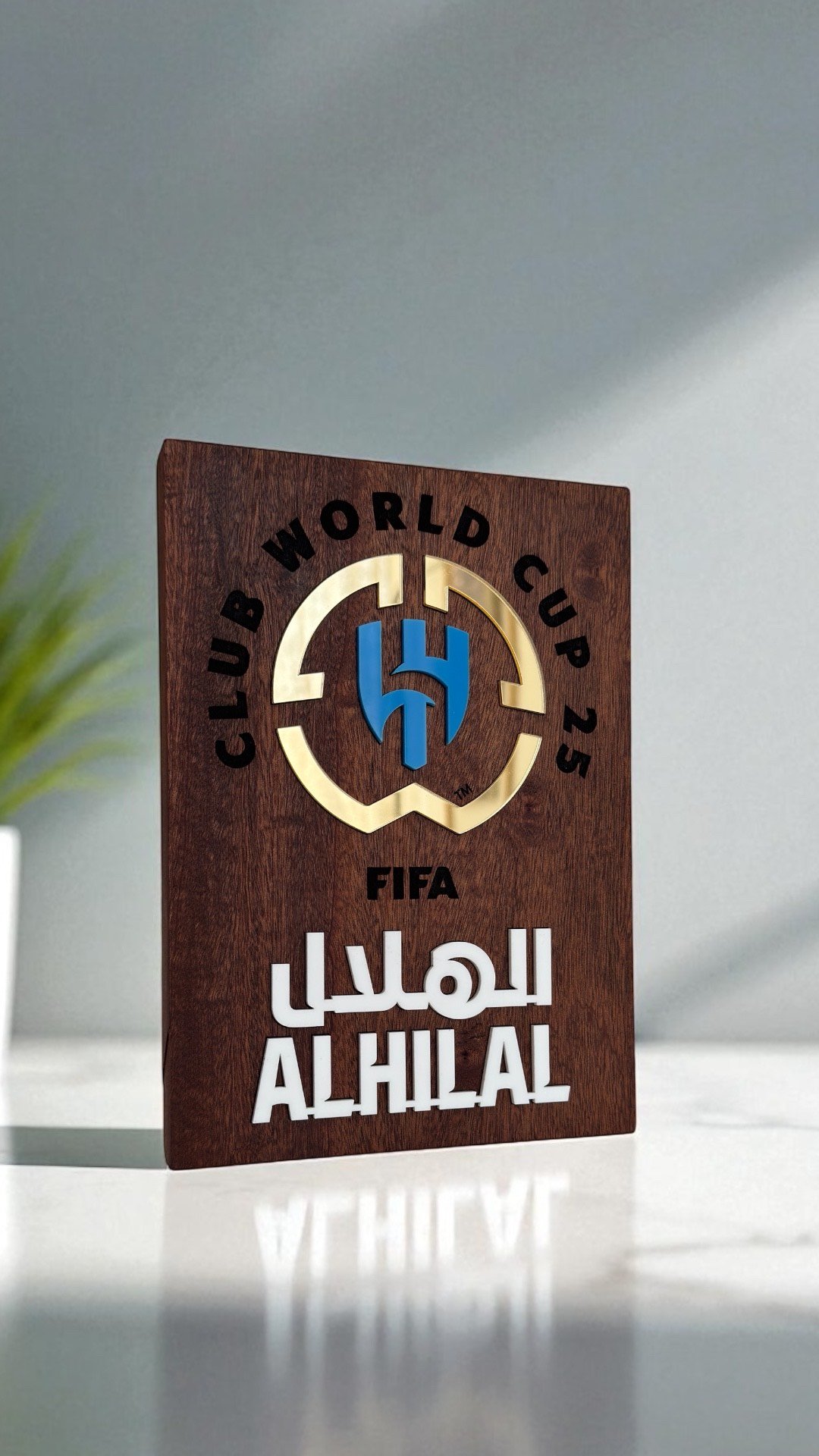 الدرع الخشبي الطبيعي النوع الفاخر مزين بمشاركة الهلال السعودي فالعالمية