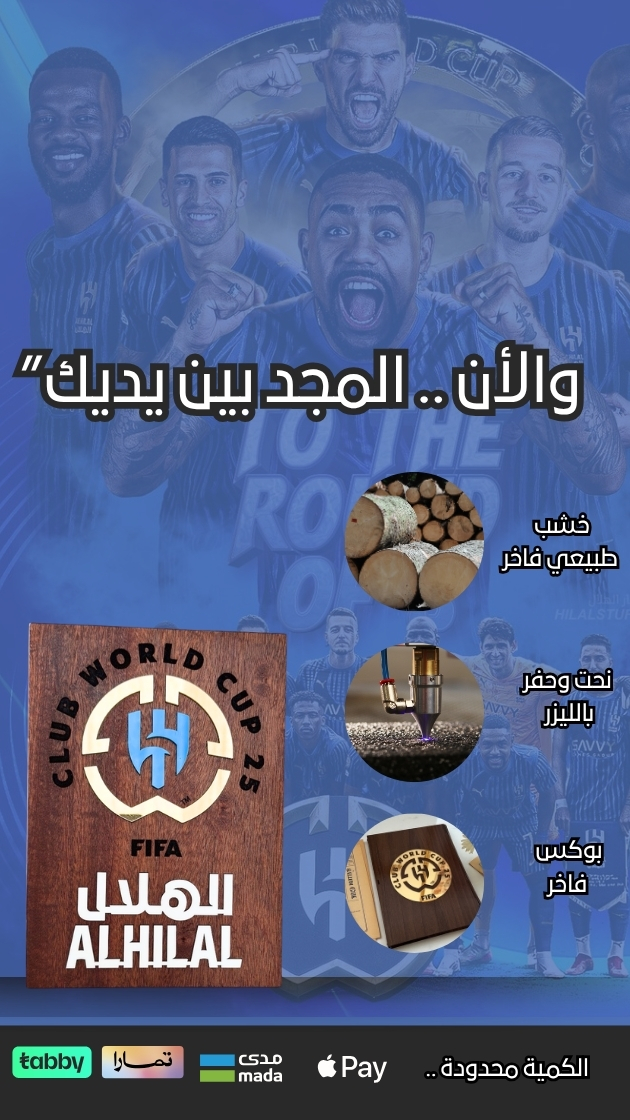 عندما تجتمع مشاركة الهلال العالمية بالخشب الطبيعي الفاخر مع تقنيات الليزر الحديثه لابد انك سوف تتفرد بفاخمة تذكار عالمي لنادي الهلال بمشاركة مشرفة بتعادل مدريد معه وفوزة على مانشستر ستي بكامل نجومة رغم ظروف الهلال . اطلبه ليبقى ذكرى خالده وتحفه فنيه فاخرة